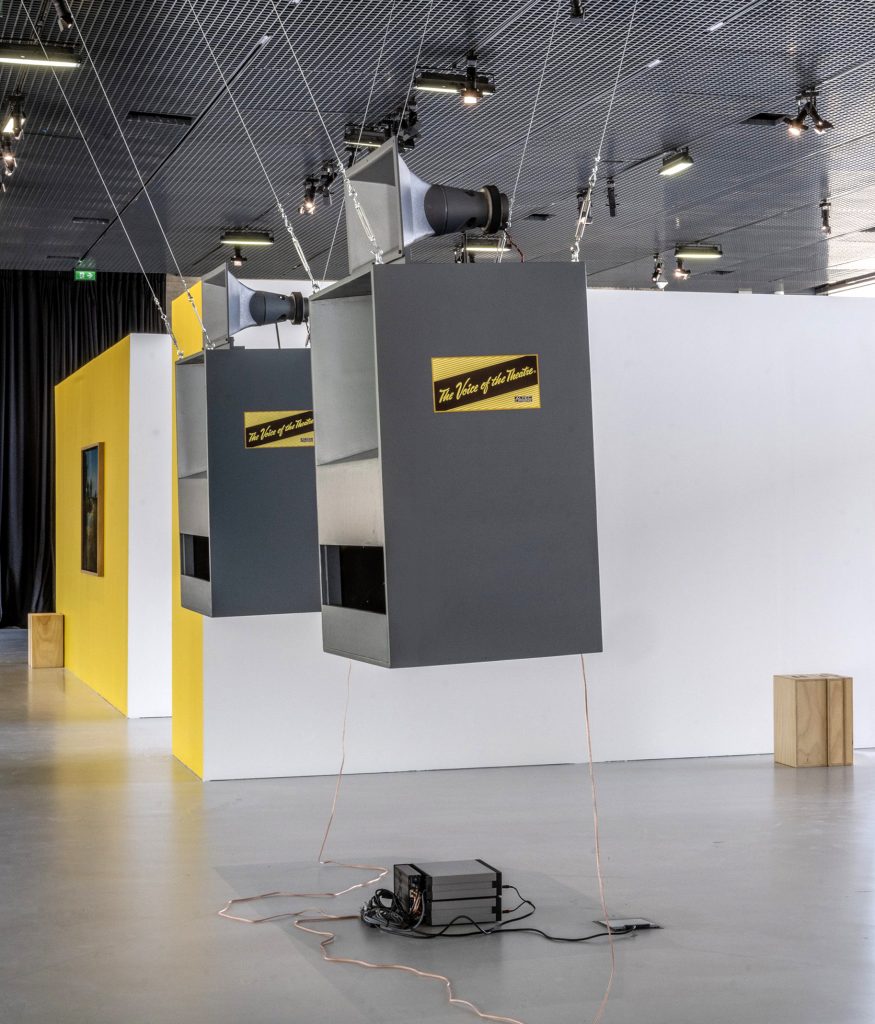 Produced from the 1940s to the 1980s to provide sound for cinemas, the Altec Lansing A8 loudspeakers were designed to provide powerful, clear sound while remaining invisible, placed just behind the screens. Voice of the Theatre is an installation in which each loudspeaker emits a slightly different note from the other one generated live by a frequency oscillator. By synchronizing and then de-synchronizing, the sound from the speakers produces a beat that forms a looping pattern in the exhibition space